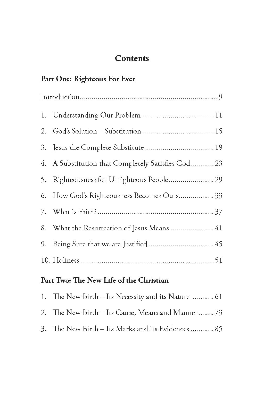 This book contains two parts. The first, simplified and abridged from Horatius Bonar's The Everlasting Righteousness, deals with the substitutionary work of Jesus Christ. Bonar shows that, in Jesus Christ, God has provided the only way to deal with the problem of our sin. The second part, taken from sermons on Regeneration by J. C. Ryle, is about the new birth, about life after conversion. Ryle addresses what it means to be born again, and what this looks like in the life of a Christian.